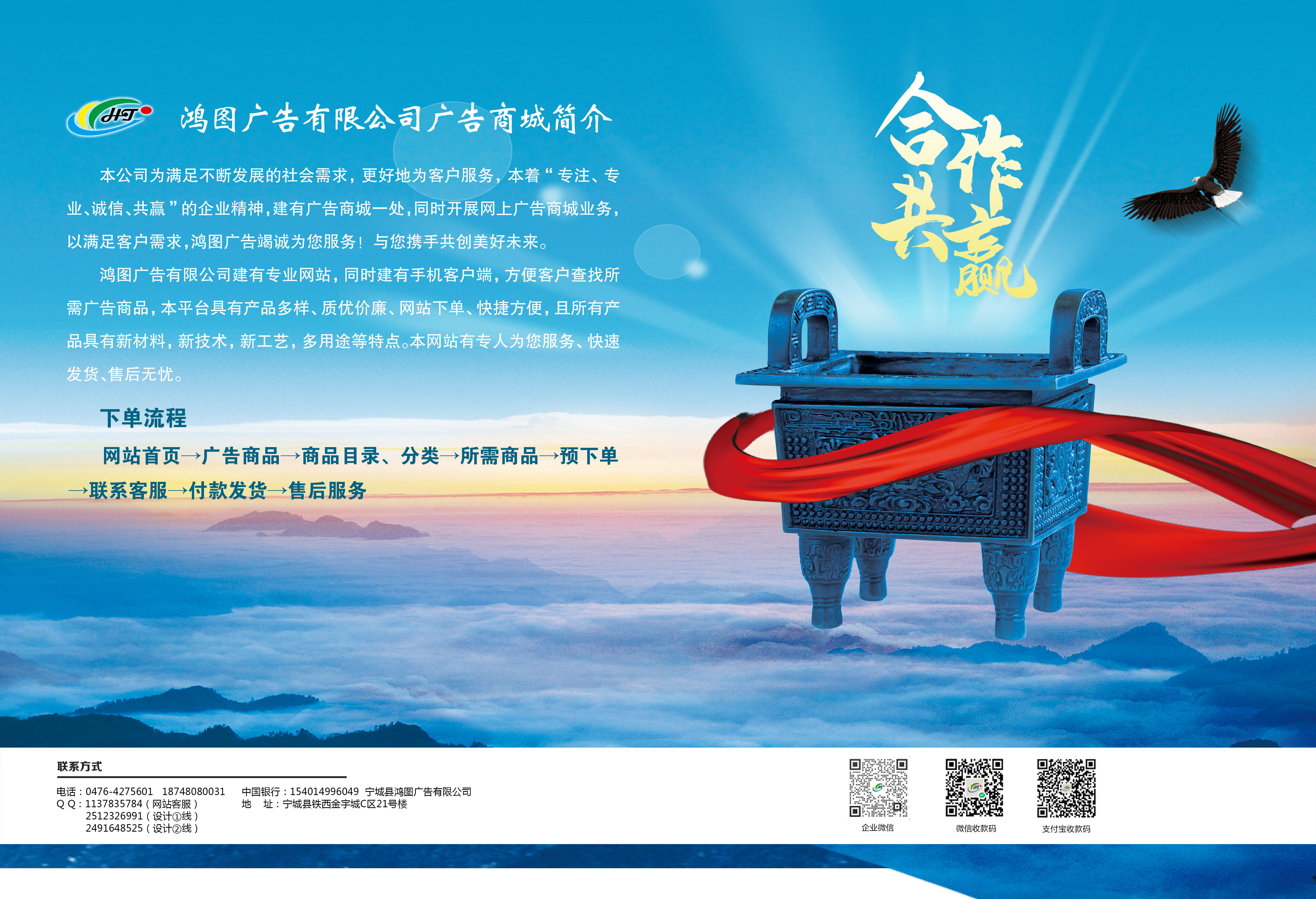 宁城县鸿图广告有限公司,是宁城县域内一家资质深厚、专业精粹、风格别致、色彩自然的广告制作公司,是集设计、制作、代理、发布为一体的专业化广告制作基地。公司坐落于天义镇金融街西段、金宇城C区街面,规制宏大,制作场地开阔。设备齐全、精良,智能技术雄厚。公司管理层,文化素质涵幽沉实;员工技能高超,服务水平上乘,彰显着新时代企业文明。公司声誉博远,口碑传美,是区域首屈一指的硬活之家。